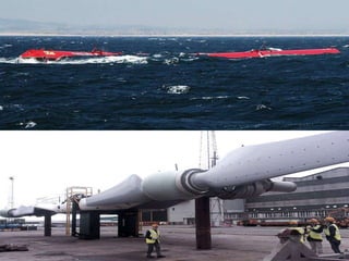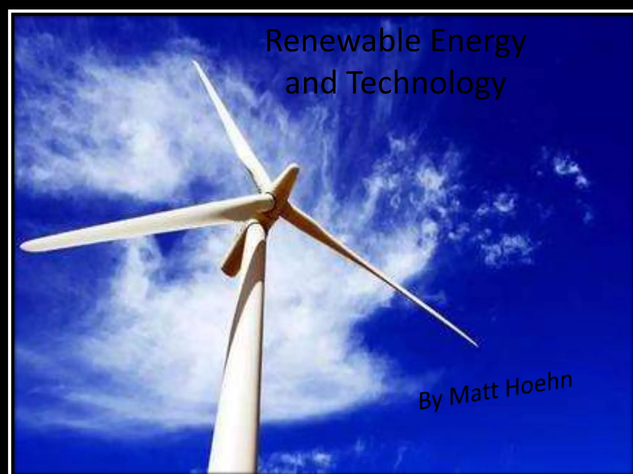 Renewable Energy and Technology discusses the benefits of renewable energy sources such as wind and solar power. Fossil fuels produce pollution and greenhouse gases that contribute to global warming, while renewable resources provide clean energy without these negative effects. The document outlines how wind power has significantly grown in places like Europe and India, creating new jobs and powering many homes. Solar energy is also discussed as the most abundant resource, with examples of large solar plants and farms powering thousands of homes through renewable technology. Overall, the adoption of renewable energy and new clean technology can reduce greenhouse gases to benefit the environment while generating millions of new jobs.