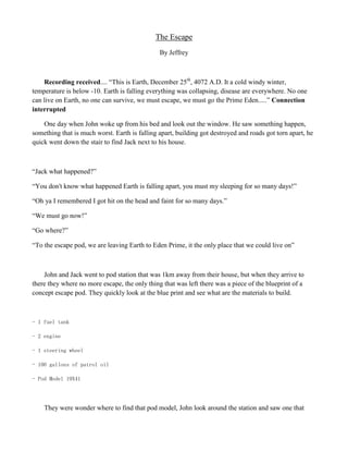 John and Jack must escape Earth as it is collapsing due to extreme weather and disease. They find the blueprint for an escape pod and gather the necessary parts from around their town. After assembling the pod, they launch just before Earth is completely destroyed. When they land on Eden Prime, they find that others have also escaped to the new planet, which may become humanity's new home.