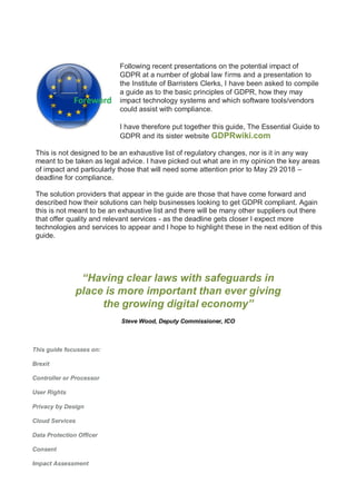 The document provides a summary of the key aspects of the General Data Protection Regulation (GDPR) in 3 pages. It discusses the basic principles of GDPR, how it may impact technology systems, and software tools that can help with compliance. Some of the main topics covered include the definition of personal and sensitive data, data subject rights, privacy by design, security requirements, and obligations for controllers and processors. The summary emphasizes the need for businesses to focus on compliance given the enhanced penalties and wider scope of GDPR.