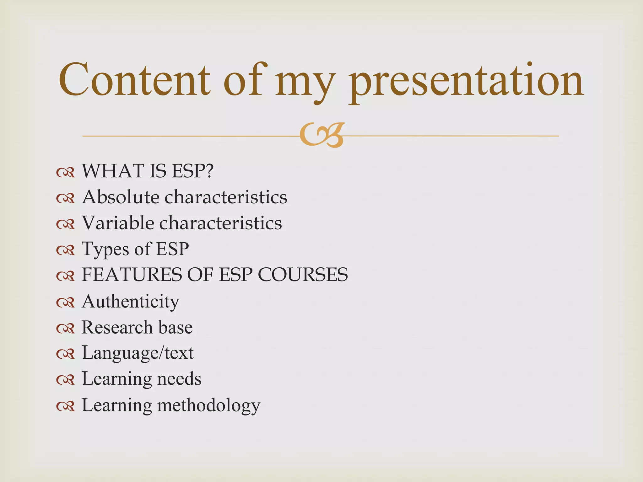 This document discusses English for Specific Purposes (ESP). It defines ESP as an approach focused on meeting the specific language needs of learners for their disciplines or occupations. ESP has absolute characteristics like being designed for specific skills and not following one methodology. It also has variable characteristics like the type focusing on academics, occupations, or fields like science or medicine. The document outlines features of ESP courses like using authentic materials and being oriented to the purpose and needs of learners. It discusses concepts like the research base, language and text analysis, identifying learners' needs, and using a learner-centered methodology. In conclusion, it provides information about the author and course team.