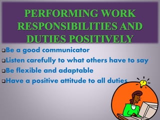 The document provides tips for effective teamwork and collaboration. It recommends being a good communicator, listening to others, and being flexible. It also suggests helping each other with tasks, seeking advice from experienced colleagues, and giving positive feedback to build confidence. Additionally, the document stresses respecting different cultures and beliefs, encouraging and supporting one another, working together towards clear goals, and sharing ideas to continuously improve team performance.