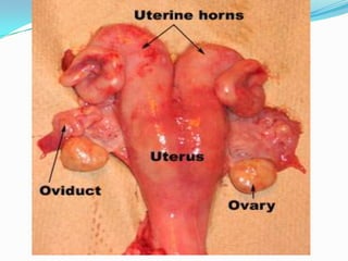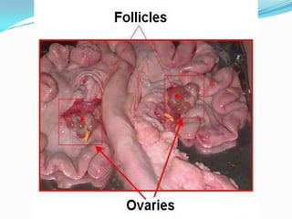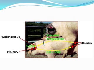 The estrous cycle refers to the physiological changes induced by reproductive hormones in female mammals. It begins at sexual maturity and is interrupted by pregnancy or anestrous phases. The cycle is regulated by hormones like GnRH, FSH, LH, estrogens and progesterone. In most species, the cycle involves the stages of proestrus, estrus, metestrus, and diestrus and results in ovulation about halfway through. The length and timing of the estrous cycle varies between species but generally allows females to be sexually receptive and able to conceive when environmental conditions favor survival of offspring.