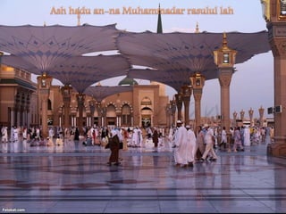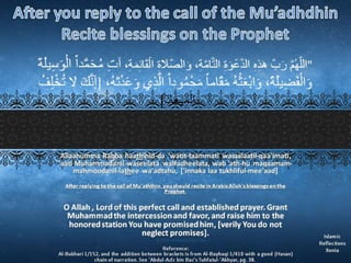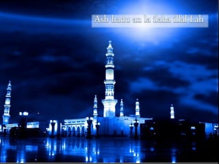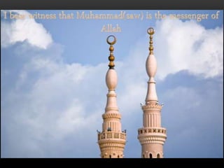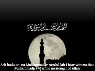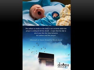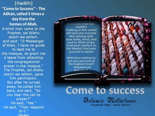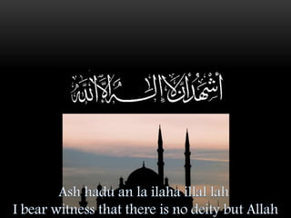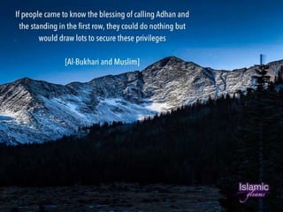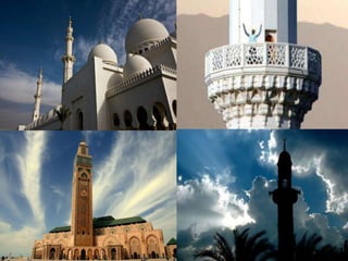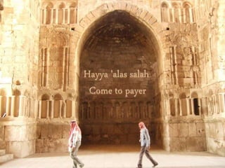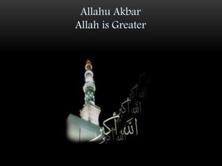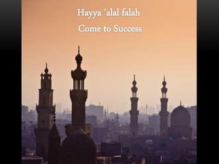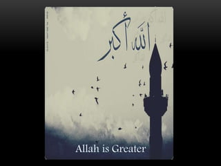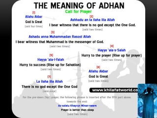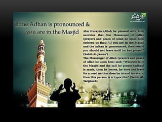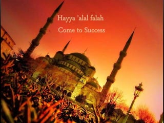 The document discusses the significance of the adhan, the Islamic call to prayer, emphasizing its role in connecting believers to Allah and promoting community, discipline, and spirituality. It highlights the key messages conveyed in the adhan, such as the oneness of God, the importance of prayer, and the call to morality and righteousness. Additionally, the adhan serves as a reminder to prioritize spiritual obligations over worldly concerns and fosters unity among Muslims worldwide.