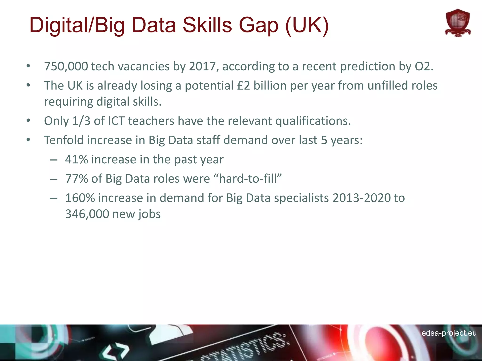 The EDSA project aims to bridge the data science skills gap in Europe by establishing a community of educators, learners, and practitioners while offering a diverse portfolio of courses and resources. With a significant increase in demand for data science professionals, the project focuses on delivering multimedia-rich, multi-language curriculum materials through various channels including MOOCs and eBooks. The initiative involves continuous feedback and revision of the curriculum to adapt to the rapidly evolving field of data science.