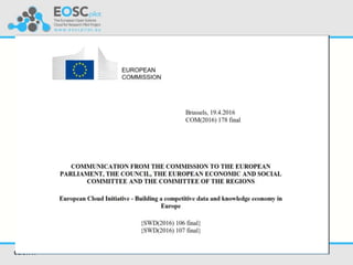 The European Open Science Cloud (EOSC) aims to enhance data sharing across research communities by creating an open science infrastructure that overcomes existing fragmentation and interoperability challenges. Key initiatives include the establishment of a governance framework, development of demonstrators for various scientific domains, and fostering engagement among stakeholders to build an open science culture. The project is supported by a €10 million funding for 33 partners to develop services and policies promoting data reuse and collaboration across disciplines.