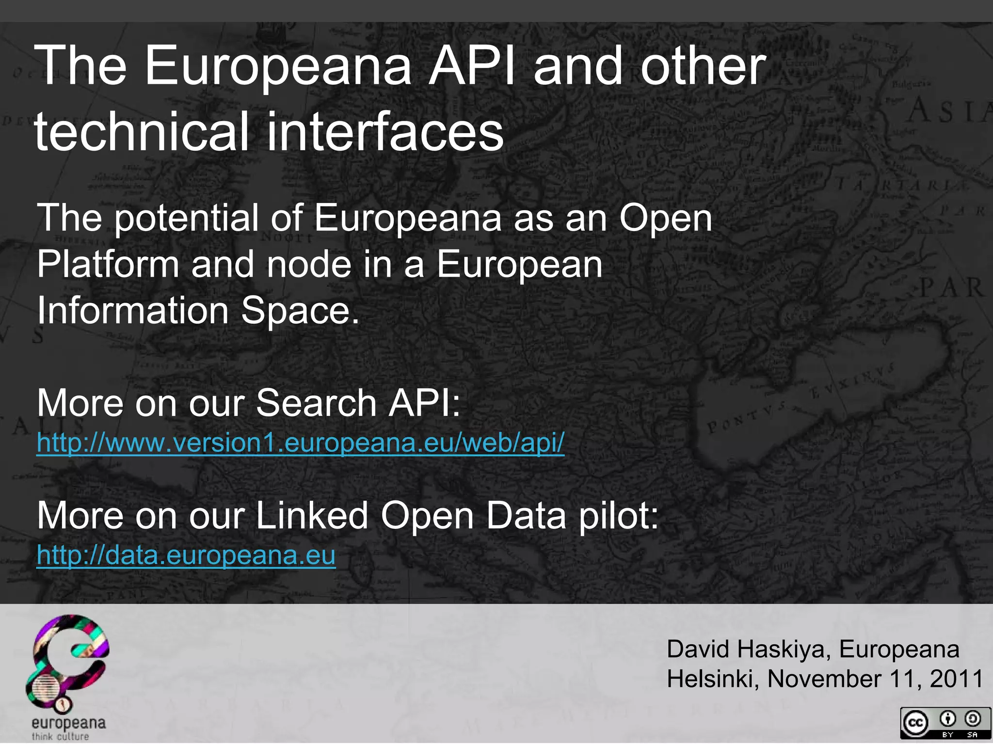 The document discusses Europeana's technical interfaces such as its Search API, Linked Open Data pilot, and other tools that allow access to Europeana's cultural heritage data. It provides examples of how organizations in Sweden, Poland, and France have used Europeana's API. The document urges for Open Data licensing to allow developers full use of the data and fuel further creativity, engagement, and economic growth. It envisions Europeana becoming a network that connects cultural heritage institutions and data across Europe.