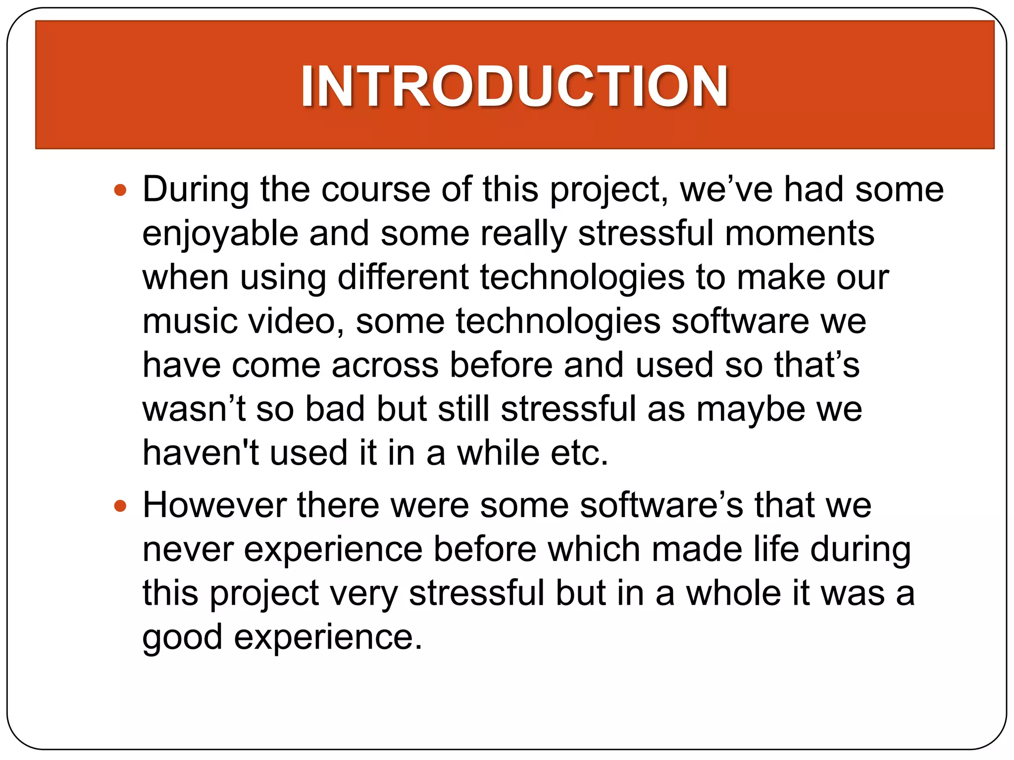The document discusses the use of new media technologies in the production of a music video project. Photoshop and Final Cut Pro were the two most important programs used to create the magazine advert, digipak, and edit together the music video footage. Final Cut Pro was particularly challenging as the student had no prior experience with the software. Other hardware used included a Canon camera, tripod, and Apple Mac computer, which took time to learn. Facebook and YouTube were utilized to gather feedback and for research. All of the media technologies played a vital role in the project's success by providing high quality options and effects.