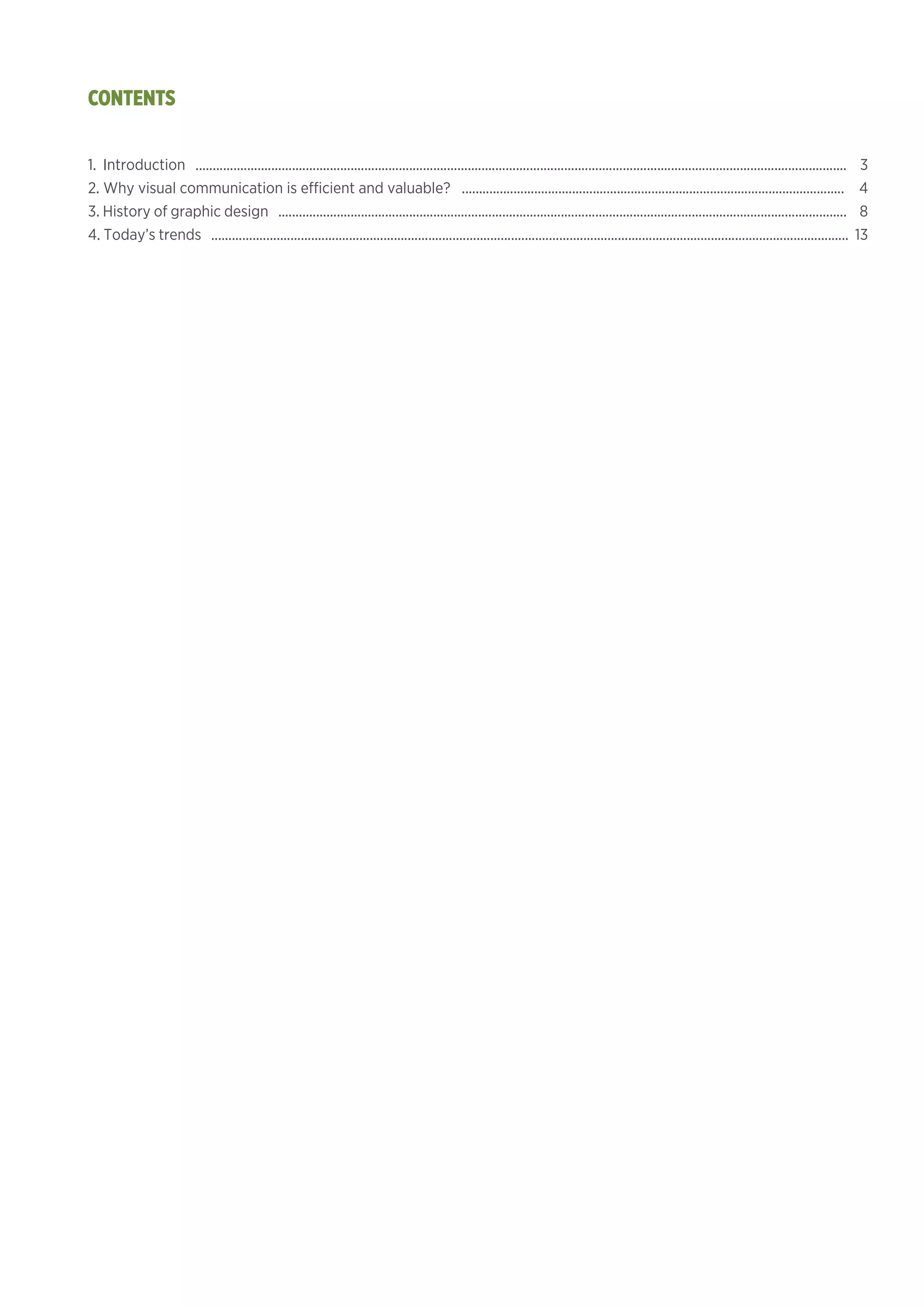 1. Introduction .............................................................................................................................................................................................3 2. Why visual communication is efficient and valuable? ............................................................................................................... 4 3. History of graphic design ..................................................................................................................................................................... 8 4. Today’s trends ......................................................................................................................................................................................... 13 CONTENTS