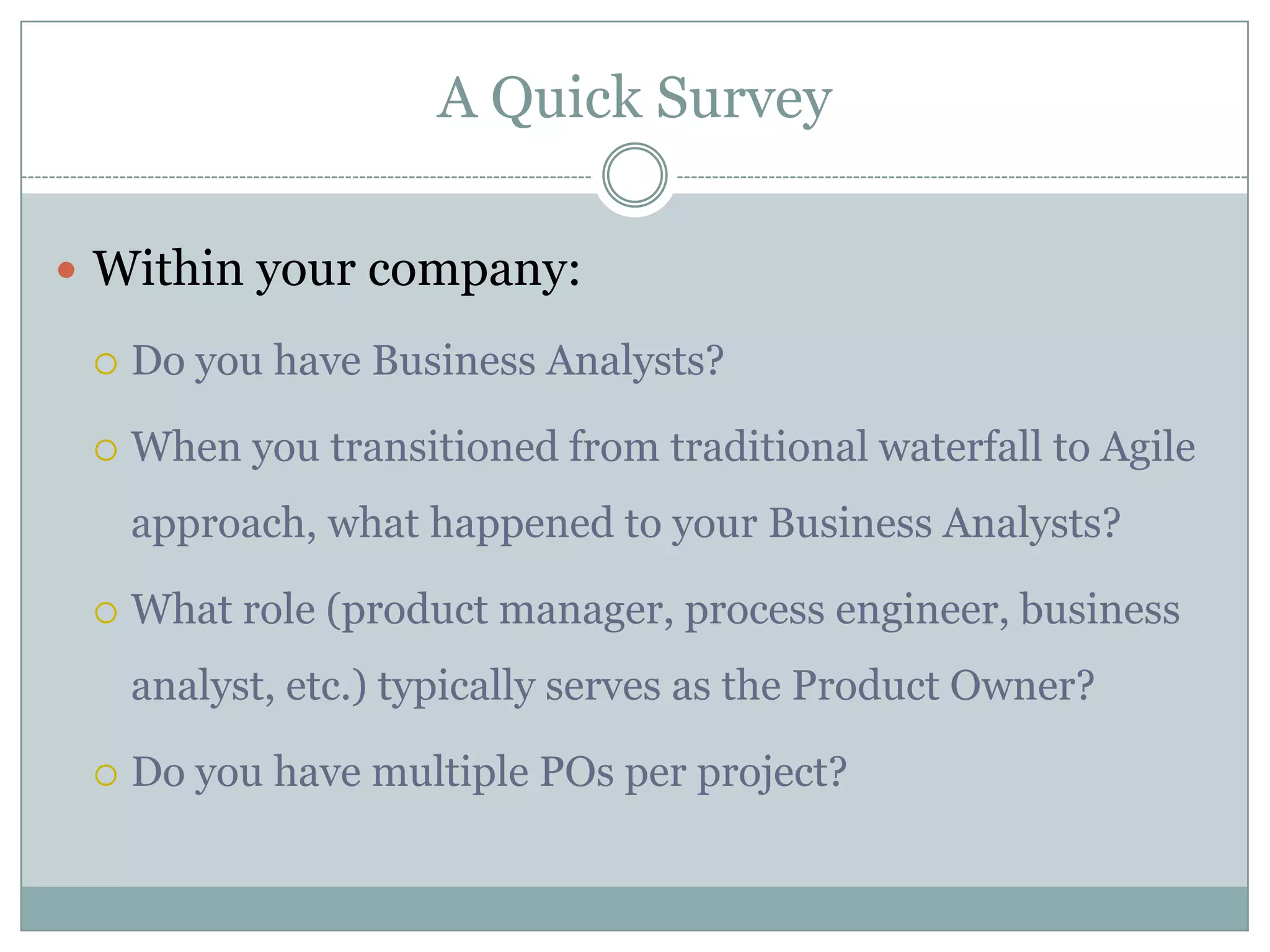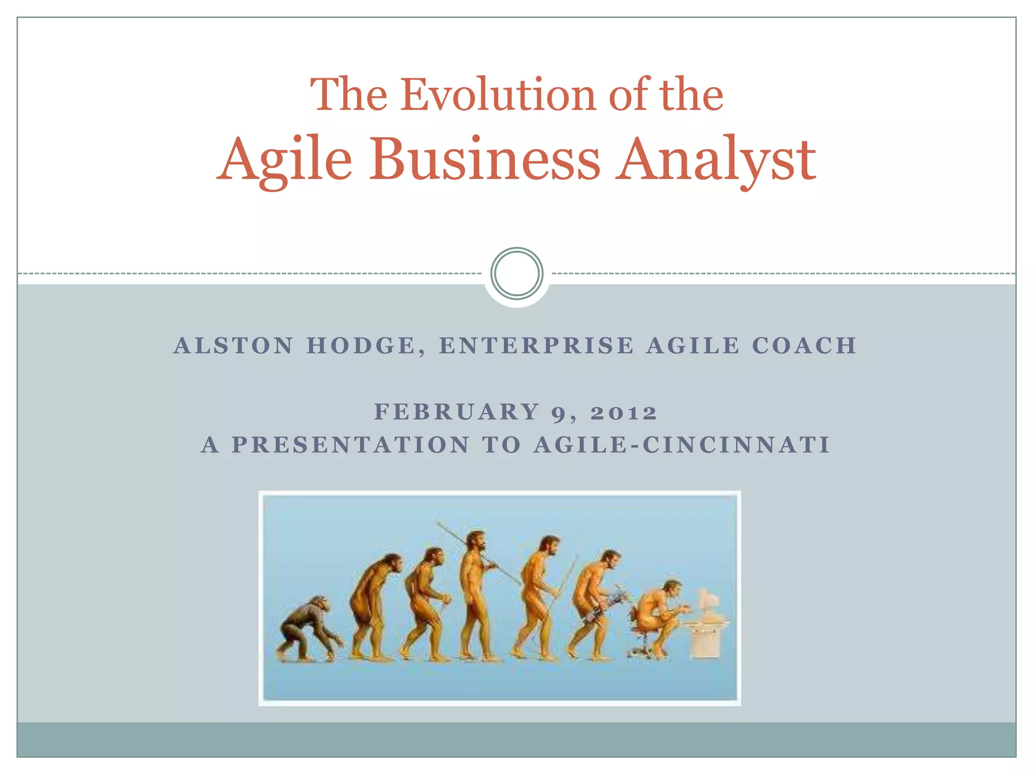 The document discusses the evolution of the business analyst role from traditional waterfall approaches to agile approaches. It describes how the role has changed from requirements gathering to serving as the product owner. Key responsibilities of the product owner are outlined. The presentation recommends that business analysts get certified in agile practices and techniques and references resources like the Agile Extension to the BABOK guide.