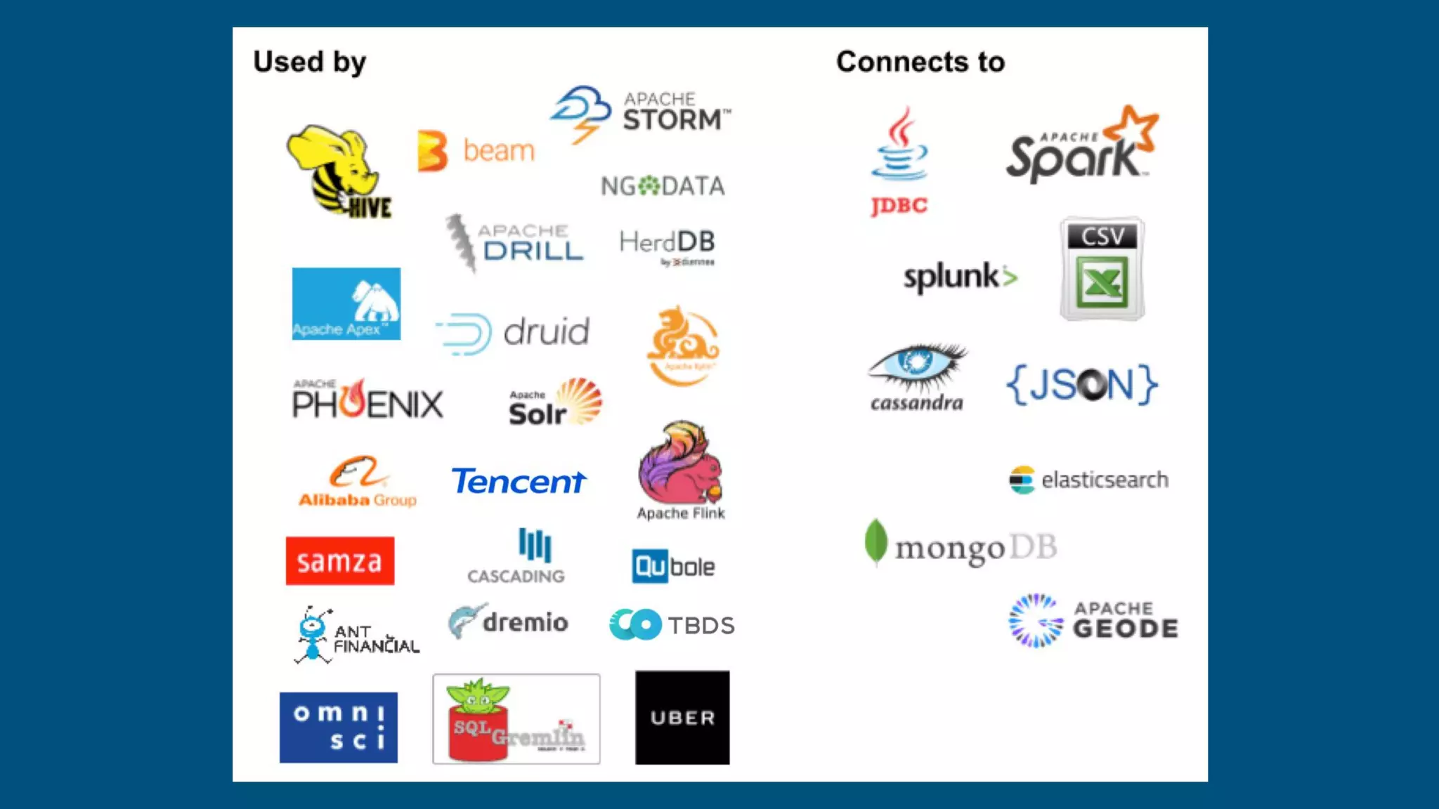The document discusses the evolution of Apache Calcite, its community growth, and the design considerations for a successful open-source project. It highlights Calcite's goals to enhance database management systems and the importance of a permissive license, community nurturing, and user-focused design. Additionally, it outlines various pluggable components, federation via adapters, and the utility of Calcite across different applications.