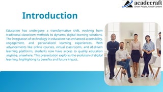 The document discusses the evolution of education from traditional methods to digital learning solutions, emphasizing enhanced accessibility and personalized experiences. It highlights key features like interactivity, flexibility, and collaboration while addressing benefits such as global accessibility and cost-effectiveness, as well as challenges like the digital divide and self-discipline. The future of digital education will integrate advanced technologies like augmented reality and artificial intelligence to create more immersive and adaptable learning environments.