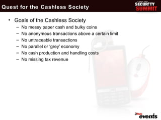This document discusses the evolution of digital cash and cryptocurrencies like Bitcoin. It outlines the goals and concerns of a cashless society, provides background on early digital cash systems, and describes how Bitcoin introduced a decentralized digital currency using cryptography. The document reviews Bitcoin statistics and applications, discusses security issues and regulatory concerns, and considers Bitcoin's potential future prospects as an independent digital currency.