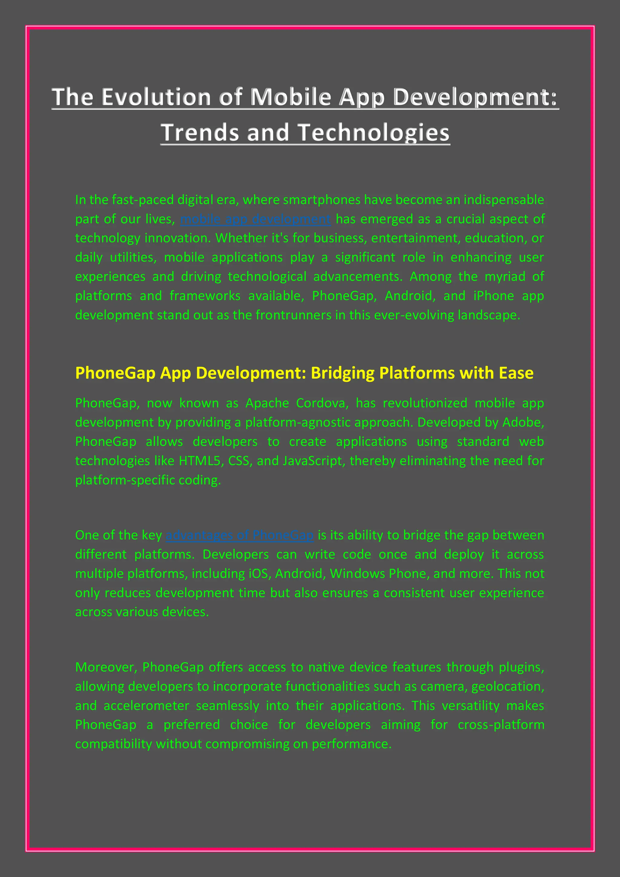 The document discusses the significance of mobile app development in the digital age, highlighting platforms such as PhoneGap, Android, and iPhone development. PhoneGap offers a cross-platform solution, Android provides extensive accessibility, and iPhone development emphasizes quality and user experience. It concludes by emphasizing the need for developers to adapt to emerging trends to drive innovation and enrich user experiences.