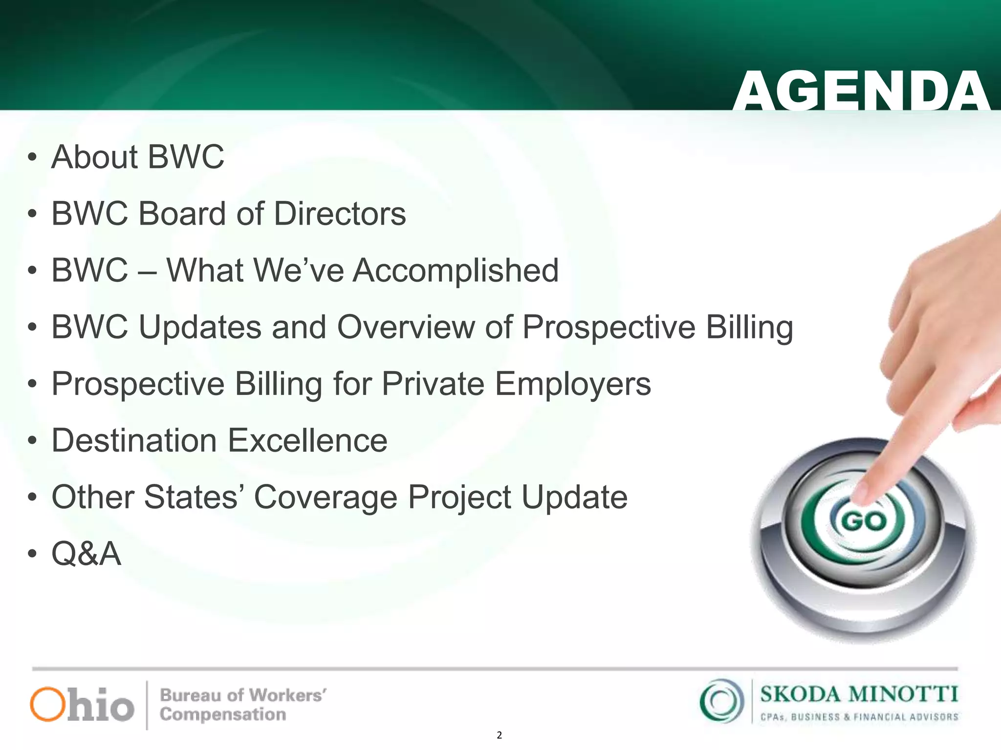 The document provides an overview of the Bureau of Workers' Compensation (BWC) in Ohio, detailing its accomplishments, such as rate reductions for private employers and increased safety grants since 2011. It introduces a new prospective billing system aimed at improving financial management and compliance while streamlining processes for employers, with a transition starting July 1, 2015. Additionally, it discusses the BWC's initiatives for safety and wellness, alongside legislative updates regarding coverage for out-of-state employees.