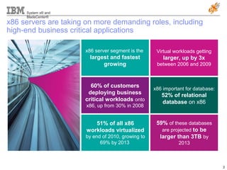 eX5 servers provide a highly reliable platform for virtualization and databases. eX5 addresses bottlenecks in memory, I/O and scalability to support large numbers of virtual machines and large database workloads more cost effectively than competitors. eX5 systems are also the most reliable x86 platforms to date.