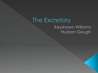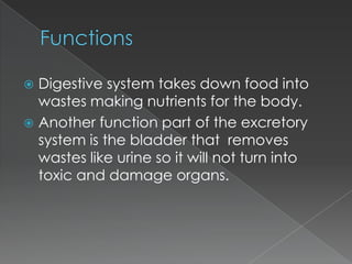 The digestive system breaks down food into nutrients and wastes. The excretory system, which includes the kidneys, ureters, bladder, and urethra, works to filter wastes from the blood and remove them from the body in urine. The kidneys filter waste from the blood, which then travels through the ureters to the bladder. The bladder stores urine until it is excreted through the urethra. Together this system removes toxins from the body through urine production and excretion.