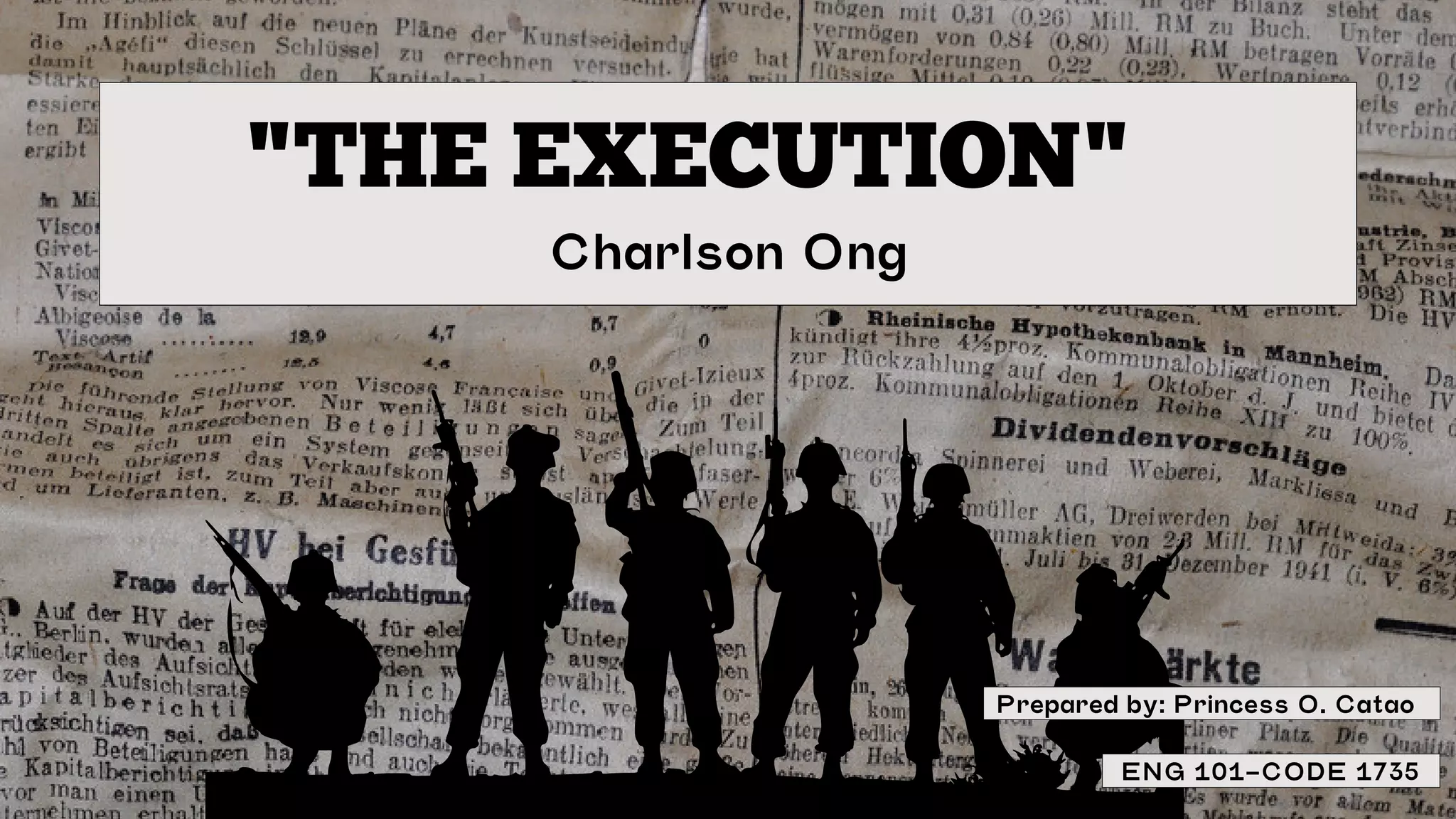 The short story "The Execution" by Charlson Ong depicts a Chinese family's experience during the Philippine Martial Law era. It focuses on how the execution of a Chinese drug lord named Lim Seng had a profound negative impact on the family, particularly the father Lim Bien-So. Angry that the Chinese community did not intervene, Lim Bien-So became distant from his family and their relationship deteriorated. He later fell ill and died, reminding the narrator Mario of the trauma of Lim Seng's execution.