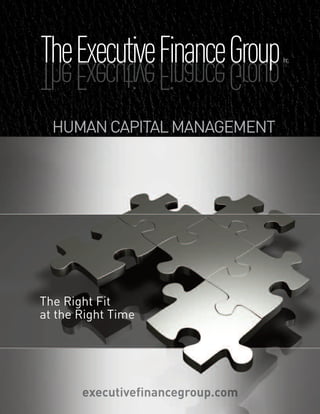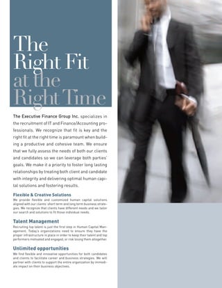 The Executive Finance Group Inc. specializes in recruiting IT and finance/accounting professionals. They recognize the importance of fit and ensuring candidates and clients' goals are aligned. They provide flexible solutions like direct hires, temporary workers, and retained searches tailored to each client's individual needs. Their mission is to form long-term partnerships with clients and candidates built on integrity and delivering optimal human capital solutions.