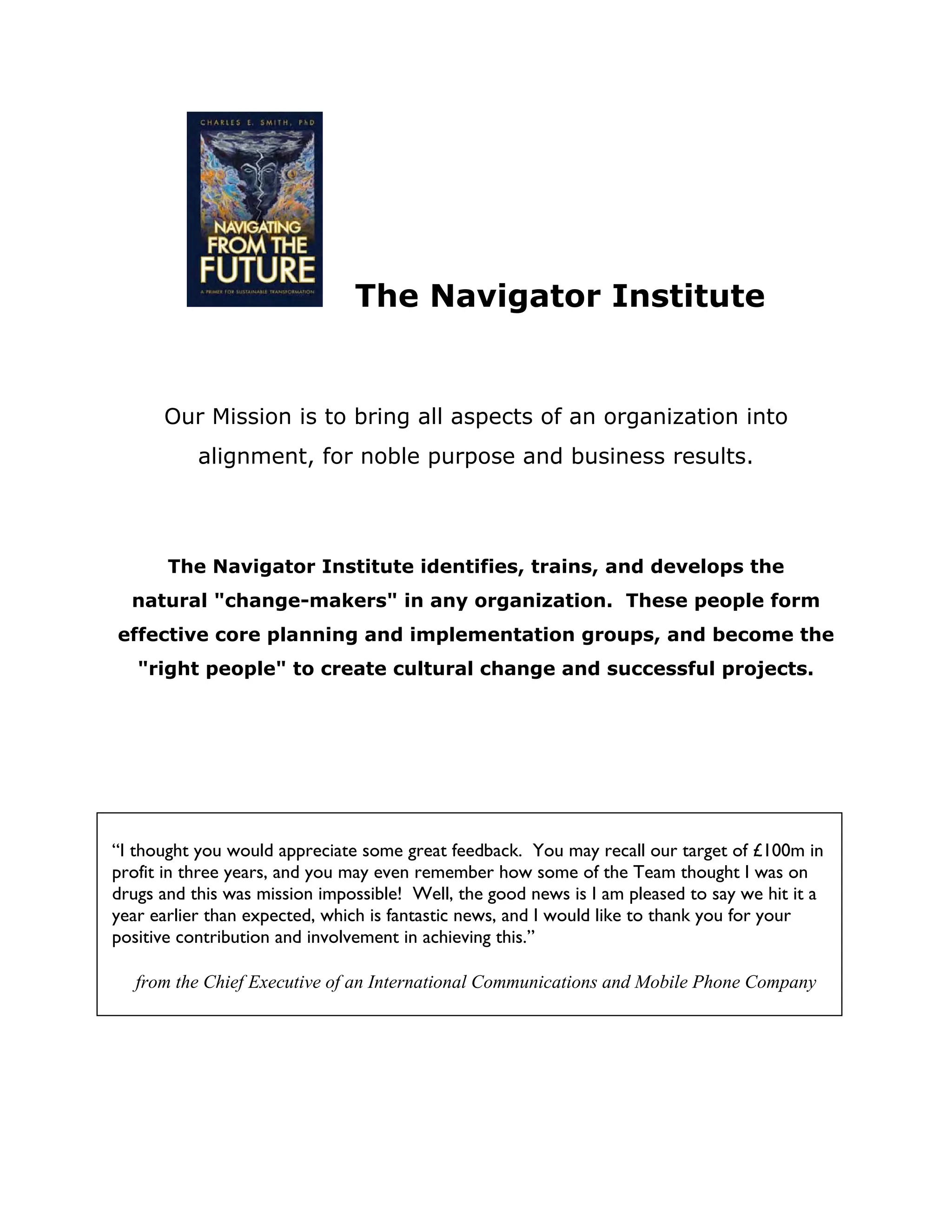 The Navigator Institute identifies and develops "change-makers" within organizations who can help drive cultural change and successful projects. These "natural change-makers" form core planning and implementation groups to bring all aspects of an organization into alignment for noble purpose and business results. The institute trains and develops these individuals through identifying, training, and developing their skills as leaders and change agents.