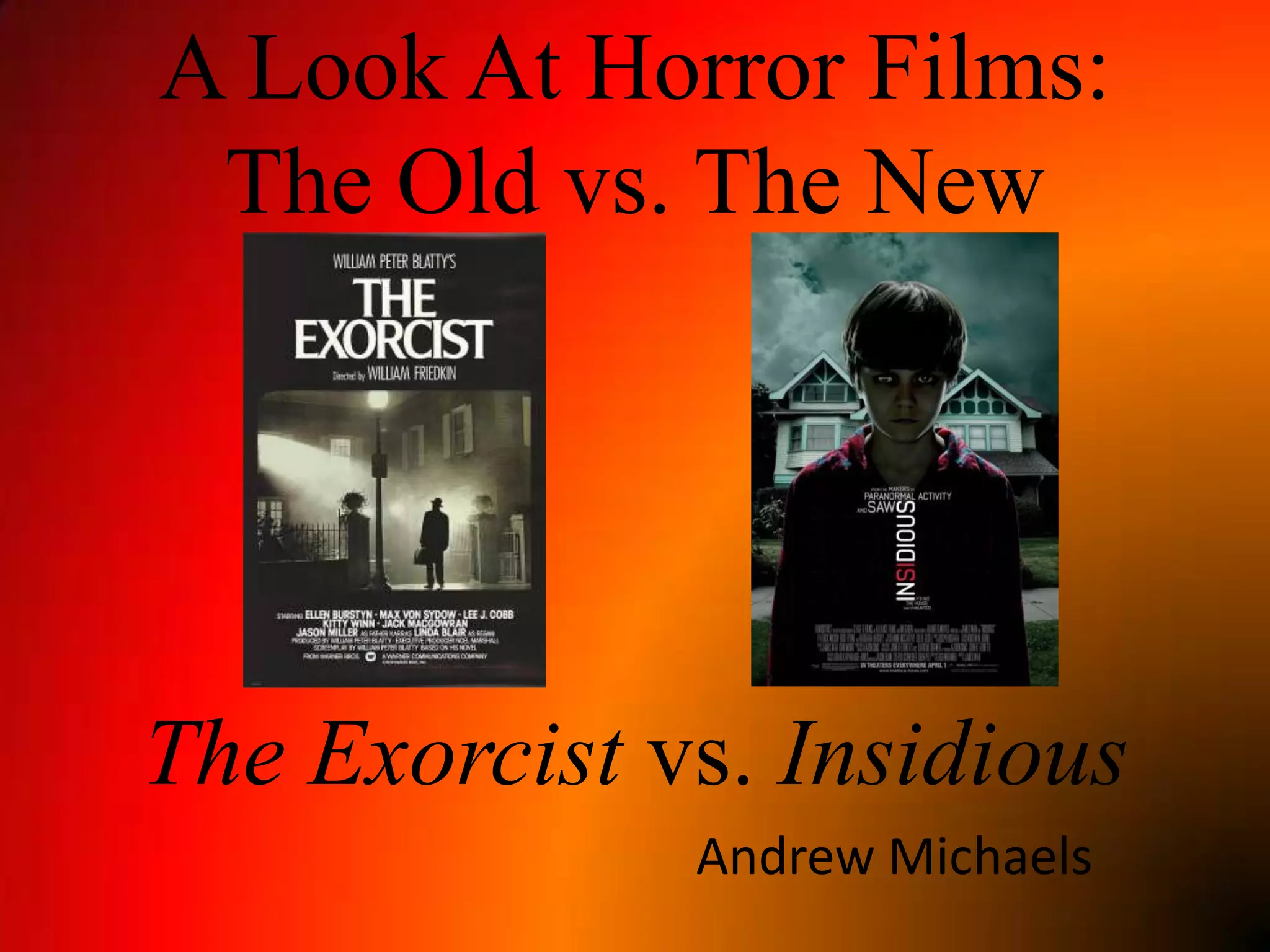 The document compares the horror films The Exorcist and Insidious, discussing their themes of man versus demons, use of dialogue and tone, and differences in how they create shock and horror through small occurrences versus modern technology. The Exorcist from 1973 relies on displaying human suffering realistically within short time frames, while Insidious from 2010 employs sneaky happenings and the extraordinary use of film mechanics to unsettle viewers.