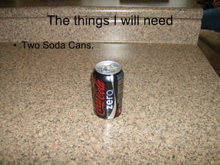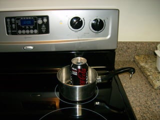 This document summarizes an experiment where a soda can filled with boiling water is crushed when submerged in cooler water. The experiment uses common household items like soda cans, tongs, and a juice container instead of lab equipment. When the heated can is placed in the cooler water, the higher pressure outside crushes the can as the pressure inside drops. This is opposite a popcorn kernel popping, where the higher pressure inside causes the kernel to expand outward rather than collapse inward.