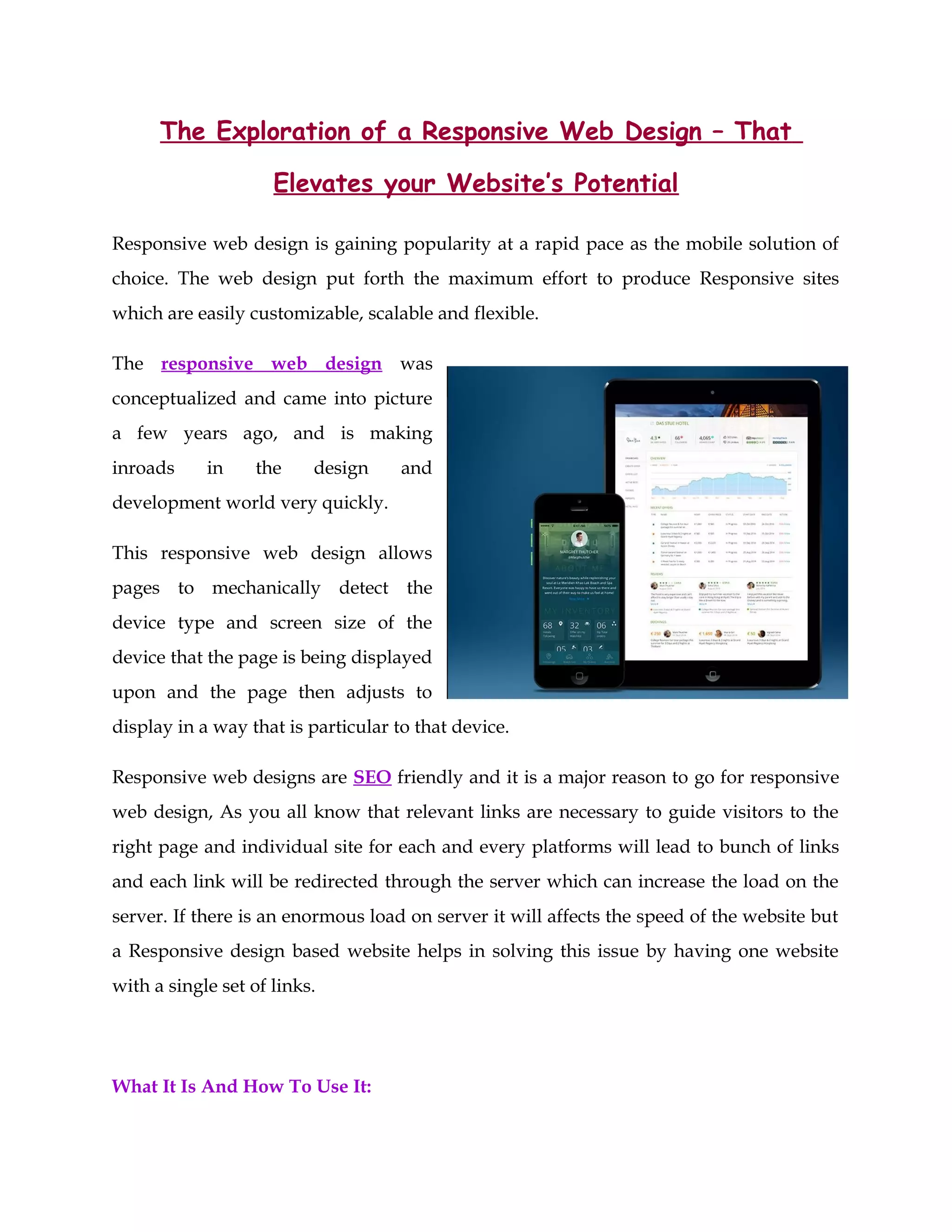 La conception web responsive est une solution de plus en plus populaire pour optimiser les sites internet sur divers appareils, permettant une personnalisation, une évolutivité et une flexibilité. Ce design permet aux pages de détecter automatiquement le type d'appareil et la taille de l'écran, garantissant une meilleure expérience utilisateur grâce à une navigation fluide. De plus, il est favorable au SEO en évitant la surcharge du serveur associée à des sites séparés pour chaque plateforme.