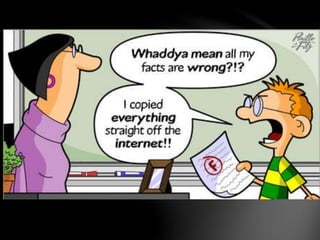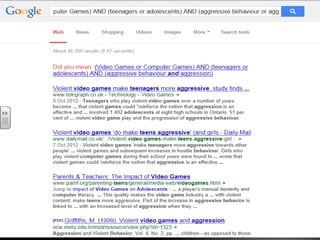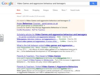 This document provides guidance to students on conducting internet research for academic projects. It discusses using search engines like Google Scholar and using Boolean search techniques with keywords and operators like AND, OR and NOT to refine searches. It then uses an example student project on whether video games increase aggression in teenagers to demonstrate how to brainstorm keywords, develop alternative search strings, and find initial secondary research to develop the project topic. Students are instructed to work in groups to research their projects and complete an activity on assessing internet sources.