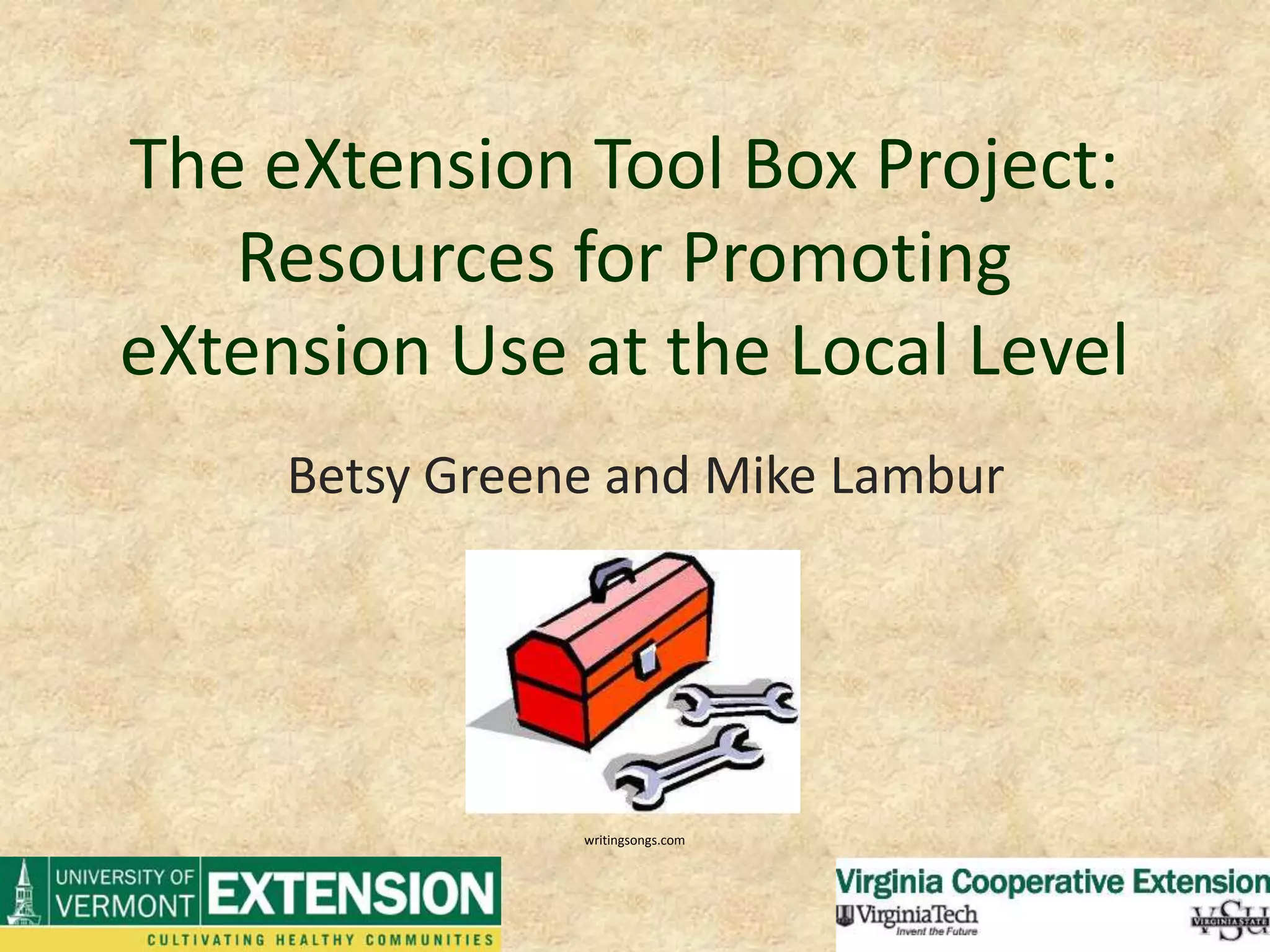 The document describes the development of an "eXtension Tool Box" to help extension employees and clients effectively use and navigate the eXtension website. The tool box will include introductory videos and tutorials on various sections of the public site, how to find and review existing resources, and how to direct clients to relevant information. It will also cover learning lessons, communities of practice, collaboration tools, events, and profiles on the internal site. The goals are to increase familiarity with eXtension resources and promote their utilization by extension personnel and clients. Feedback will be gathered through a survey to assess the tool box.