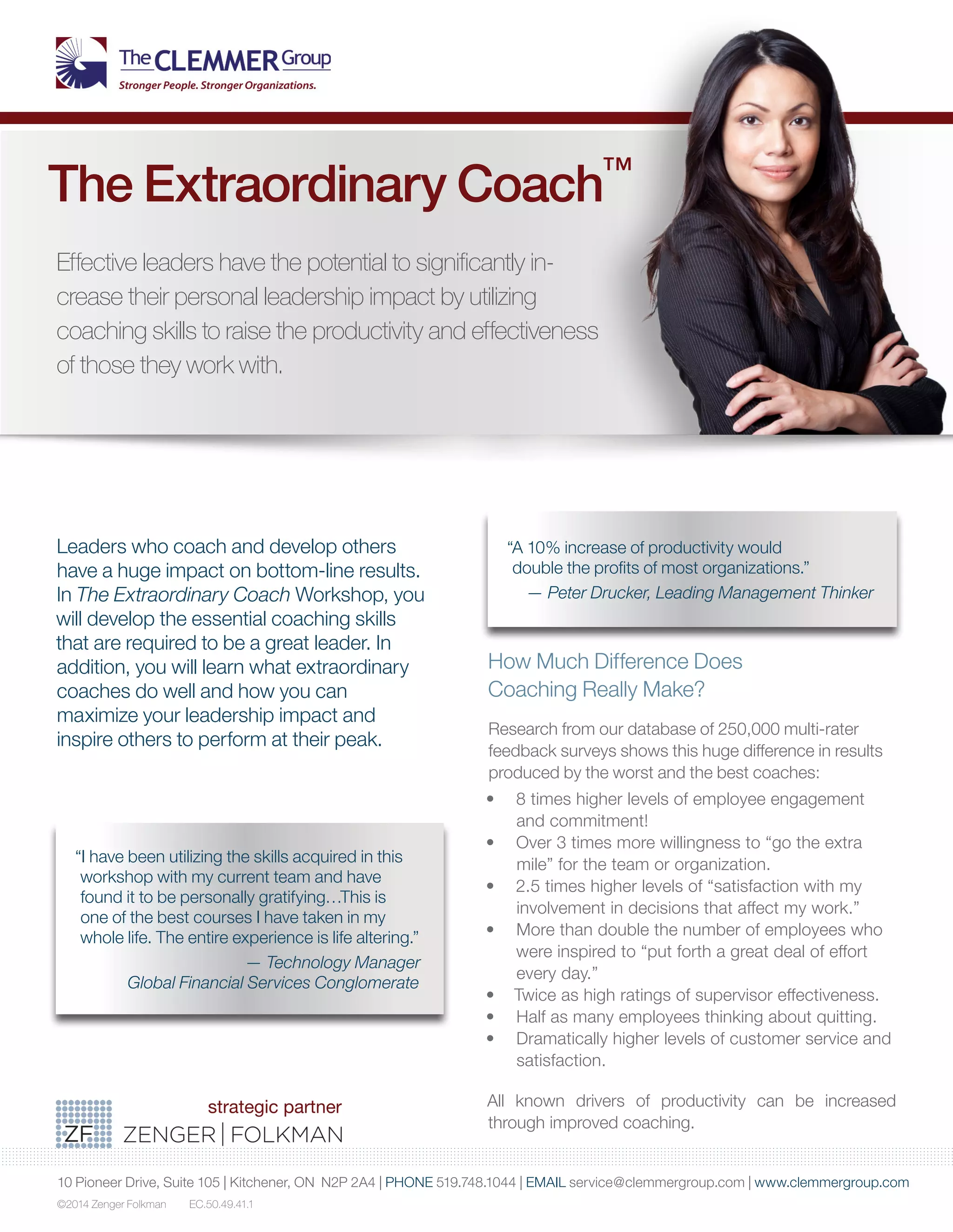 The Extraordinary Coach workshop aims to enhance leadership coaching skills that significantly impact employee engagement, productivity, and overall organizational results. Through effective coaching, leaders can inspire higher employee commitment and satisfaction while reducing turnover rates. The workshop provides practical frameworks and tools to address coaching gaps and develop effective coaching conversations.