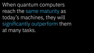 The document discusses the evolution and potential of quantum computing, highlighting its transition from a theoretical domain to practical applications in business and science. It explains key concepts such as superposition, coherence, and entanglement while showcasing quantum computing's advantages over classical computing for solving complex problems. Additionally, it outlines platforms and tools that enable developers to engage with quantum computing technology.
