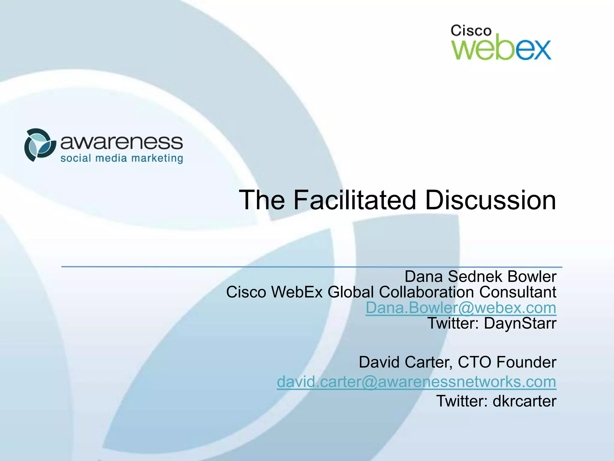 The document discusses the importance of facilitated real-time discussions for communities. It recommends selecting a focused topic, building engaging conversations through open-ended questions and participation tools, and weaving the discussion outcomes back into the community. Successful facilitation engages participants, drives the content organically, and keeps the conversation productive through involvement and acknowledgement of contributions.