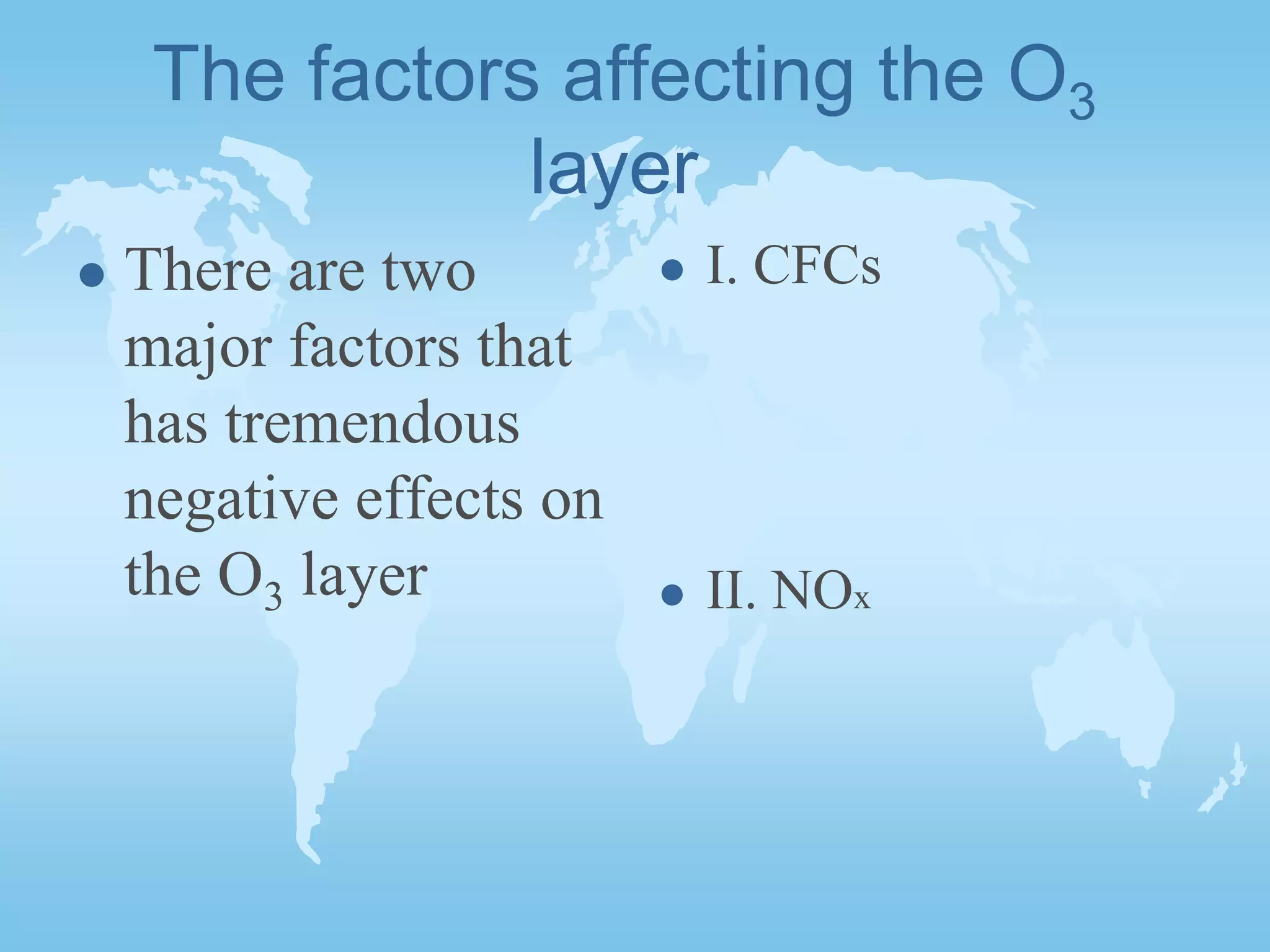 The two main factors negatively affecting the ozone layer are CFCs and NOx. CFCs released from refrigerants and air conditioners are destroyed by UV rays, releasing chlorine which then destroys ozone molecules. NOx both protects and destroys ozone depending on altitude - above 25km it destroys ozone, accounting for over 50% of total destruction, while below it protects ozone from being destroyed. The document also explains how ozone forms in the stratosphere through the combination of oxygen molecules and atoms produced by solar radiation breaking down oxygen.
