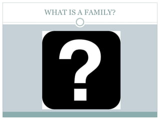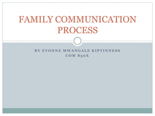 The document discusses family communication and the family communication process. It defines a family and explains that family communication refers to the exchange of verbal and non-verbal information between family members. The family communication process involves who communicates what message to whom, when, where, and how. It also discusses factors that influence communication like instrumental vs affective messaging, clear vs masked communication, and direct vs indirect communication. The document provides tips for building effective family communication and discusses the importance of communication patterns within families.