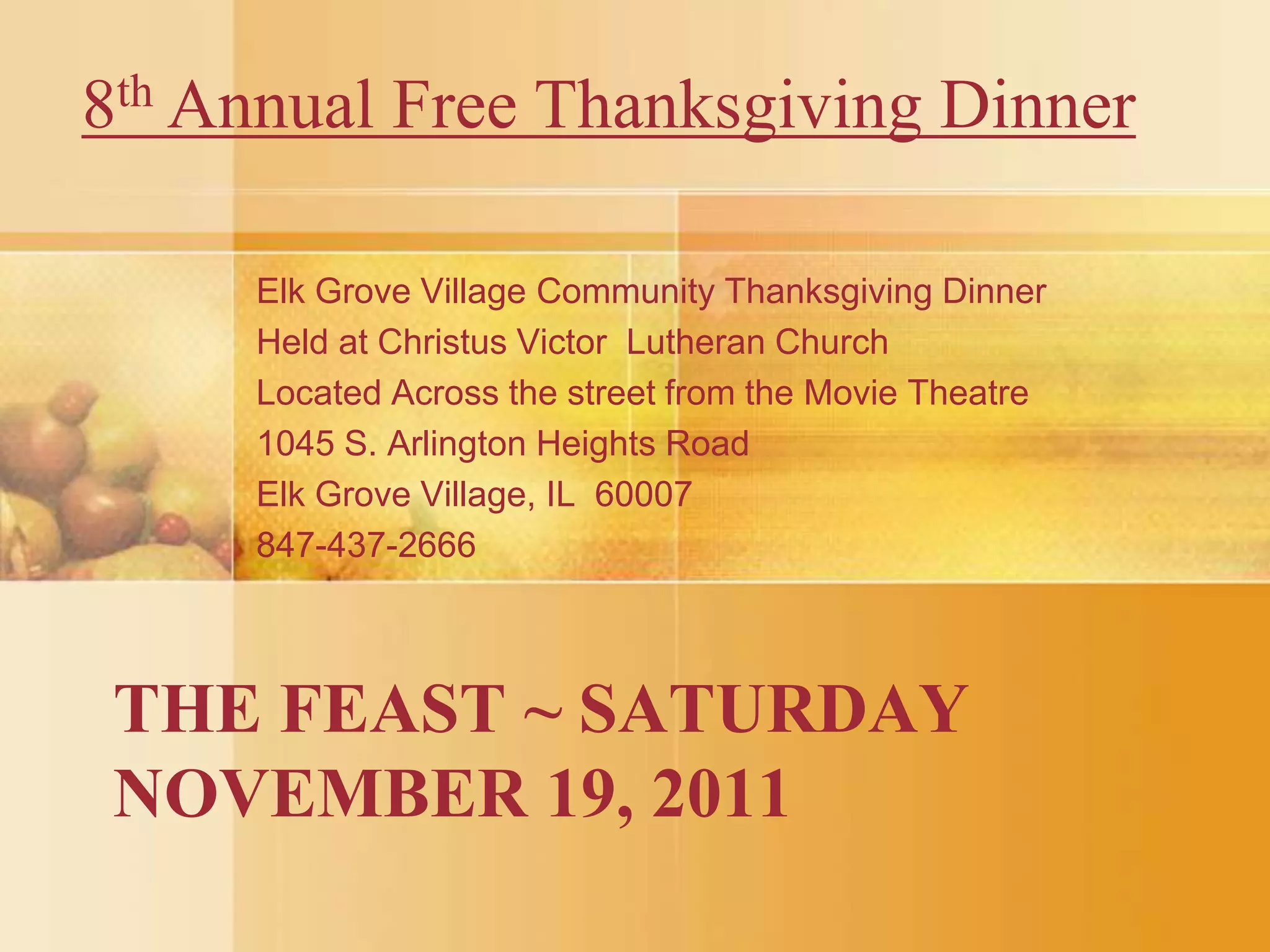 The 8th annual free Thanksgiving dinner will be held on November 19, 2011, at Christus Victor Lutheran Church in Elk Grove Village, providing a traditional feast for those in need, including hand-carved turkey and various side dishes. Reservations are required for the event, which features entertainment such as music and a Boy Scout flag ceremony. The dinner is supported by numerous local sponsors and organized by community volunteers to serve senior citizens and individuals who may be alone on Thanksgiving.