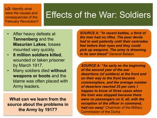 The February Revolution of 1917 in Russia was caused by widespread dissatisfaction with World War I and Tsar Nicholas II's autocratic rule. Major factors included heavy losses and poor conditions for Russian soldiers, food and fuel shortages exacerbated by harsh winter weather, and growing strikes and protests. On International Women's Day, demonstrations in Petrograd swelled to over 90,000 protesters demanding bread and an end to the war. The Tsar ordered military suppression but the soldiers mutinied, depriving the Tsar of power. Nicholas abdicated on March 2, ending over 300 years of Romanov rule and beginning Russia's transition to a provisional democratic government.