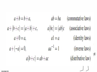 Dokumen tersebut membahas tentang aksioma lapangan yang mendasari operasi hitung bilangan, termasuk hukum komutatif dan asosiatif penjumlahan dan perkalian serta hukum distributif.
