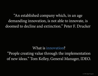 The Fifth Age Program aims to enhance innovation in companies through corporate coworking, leveraging principles from the global coworking movement to foster creativity and collaboration. Conjunctured Consulting Group offers this program to help organizations transform their work culture and align with the evolving nature of work, driven by autonomy and group dynamics. The document highlights the increasing relevance of coworking, particularly among US companies, and provides a framework for assessing and implementing innovative coworking practices within corporate environments.