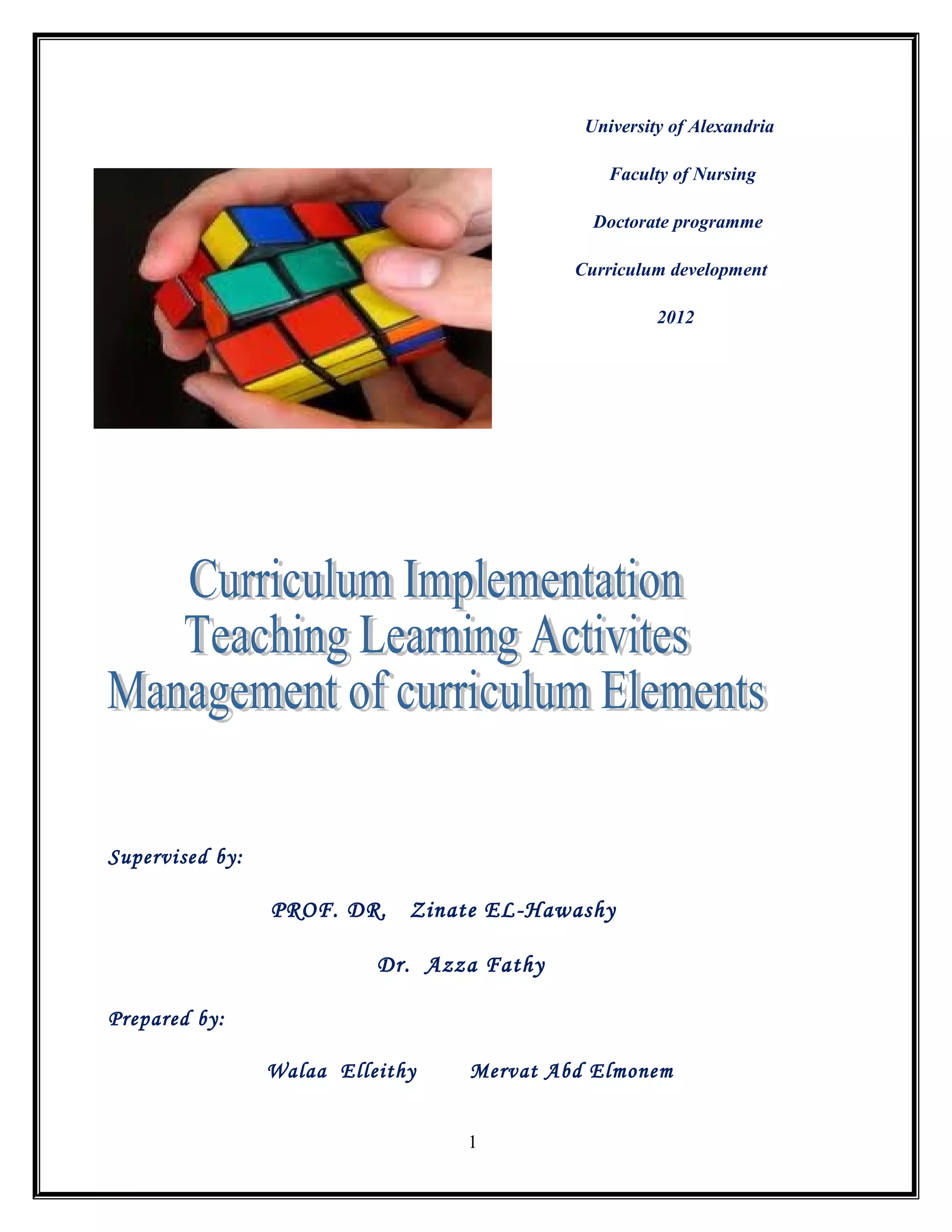 The document outlines a doctorate curriculum on curriculum development, discussing preparation activities like developing teaching and learning activities, orientation of students, and implementation through managing curriculum elements, the learning environment, and teaching activities, with the goal of training students to implement effective teaching and manage learning.