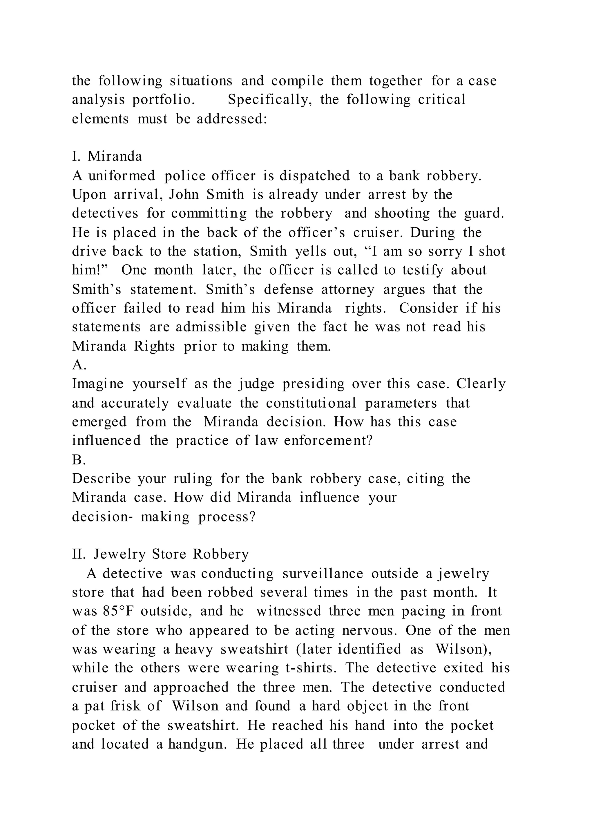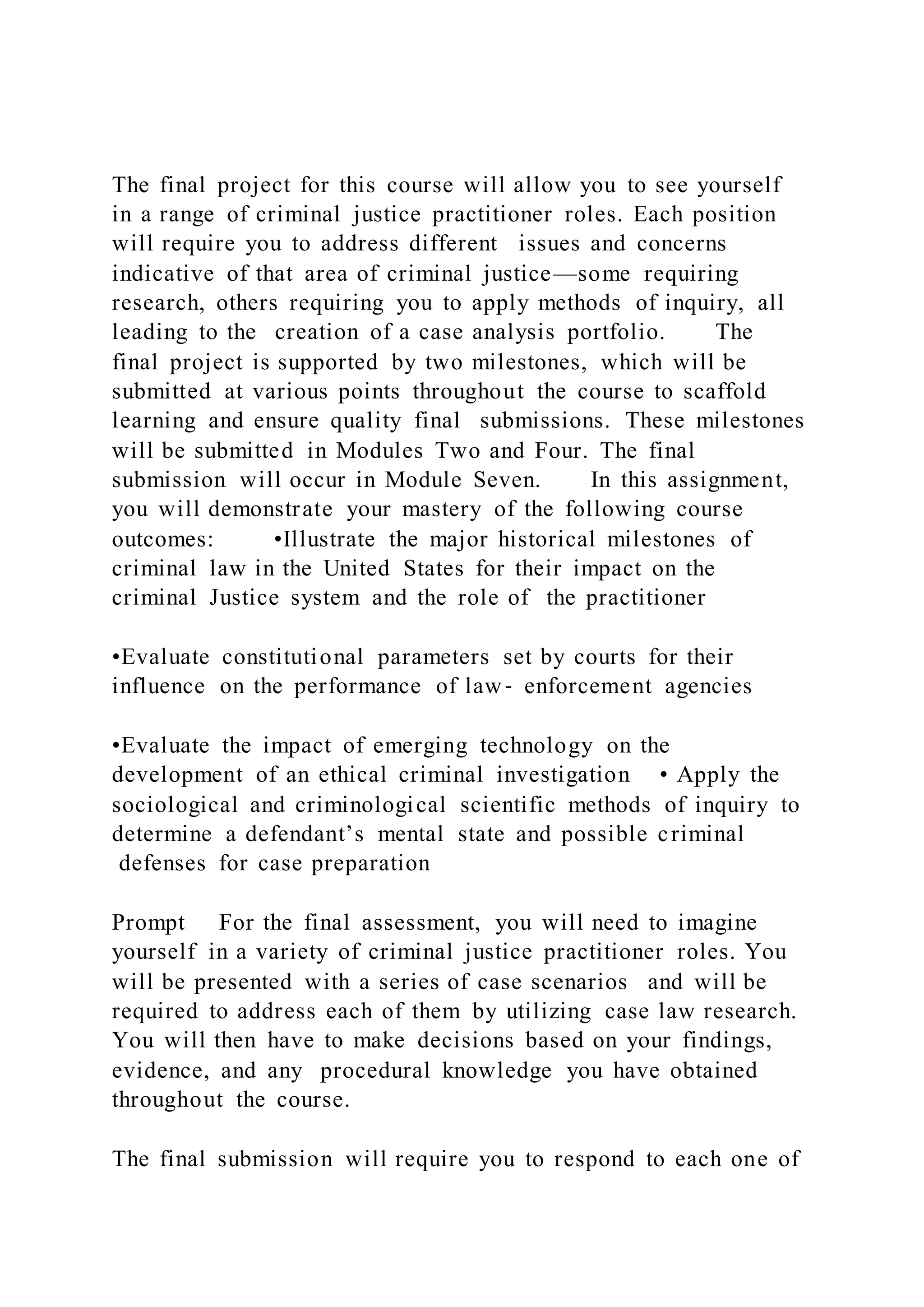 The final project for the course involves creating a case analysis portfolio that allows students to explore various roles within the criminal justice system through nine case scenarios. Each scenario requires the application of relevant legal principles, case law, and emerging technologies, evaluated across critical elements such as the impact of historical rulings and methodological inquiry into defendants' mental states. The project includes milestones for structured learning and culminates in a comprehensive submission demonstrating mastery of course outcomes.