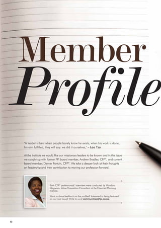 This document summarizes interviews with Andrew Bradley and Denver Fortuin, both CFP professionals and members of the Financial Planning Institute (FPI) board. Denver Fortuin discusses his career achievements, personal growth from taking on new challenges, reasons for joining the FPI board, and insights on improving member services and communication. He also shares views on leadership attributes, strategy formulation, and maintaining a work-life balance.