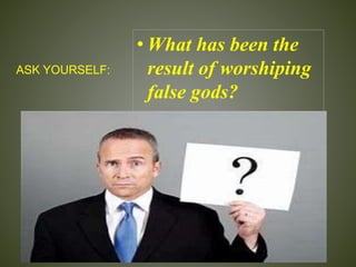 The document discusses the first two of the Ten Commandments. It explains that the first commandment means not worshipping false gods and only worshipping the true God. It warns that false gods will disappoint and hurt people. It emphasizes the importance of worshipping God alone. The second commandment prohibits making images to represent God, as no image can truly depict God, and explains that God sees problems differently than people do. It encourages sharing the message that Jesus will soon return to save people from sin and trouble.