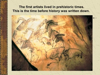 The first artists lived during prehistoric times before written history. They created cave paintings and petroglyphs that provide insights into their world. Cave paintings were made by applying pigments like ochre to cave walls, allowing us to learn about the animals that lived at that time like horses, bison, and reindeer. Petroglyphs involved carving or pecking designs into rock and may have represented early forms of pre-writing symbols. Some of the most famous cave paintings were discovered in 1940 at the Lascaux Caves in France, depicting hundreds of animals.