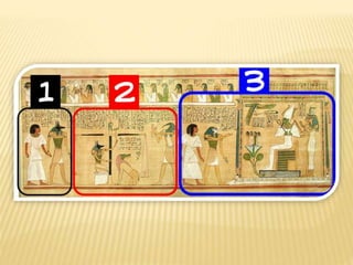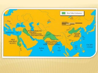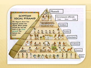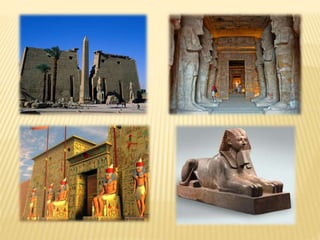The document discusses the development of ancient Egyptian civilization along the Nile River, highlighting its agricultural prosperity, political evolution, and social structure. It describes the significance of the Nile for agriculture, communication, and transportation, as well as the absolute power of the pharaoh and the stratification of society. Additionally, it covers Egyptian religion, art, and writing, illustrating the culture's beliefs in the afterlife and the importance of hieroglyphs.