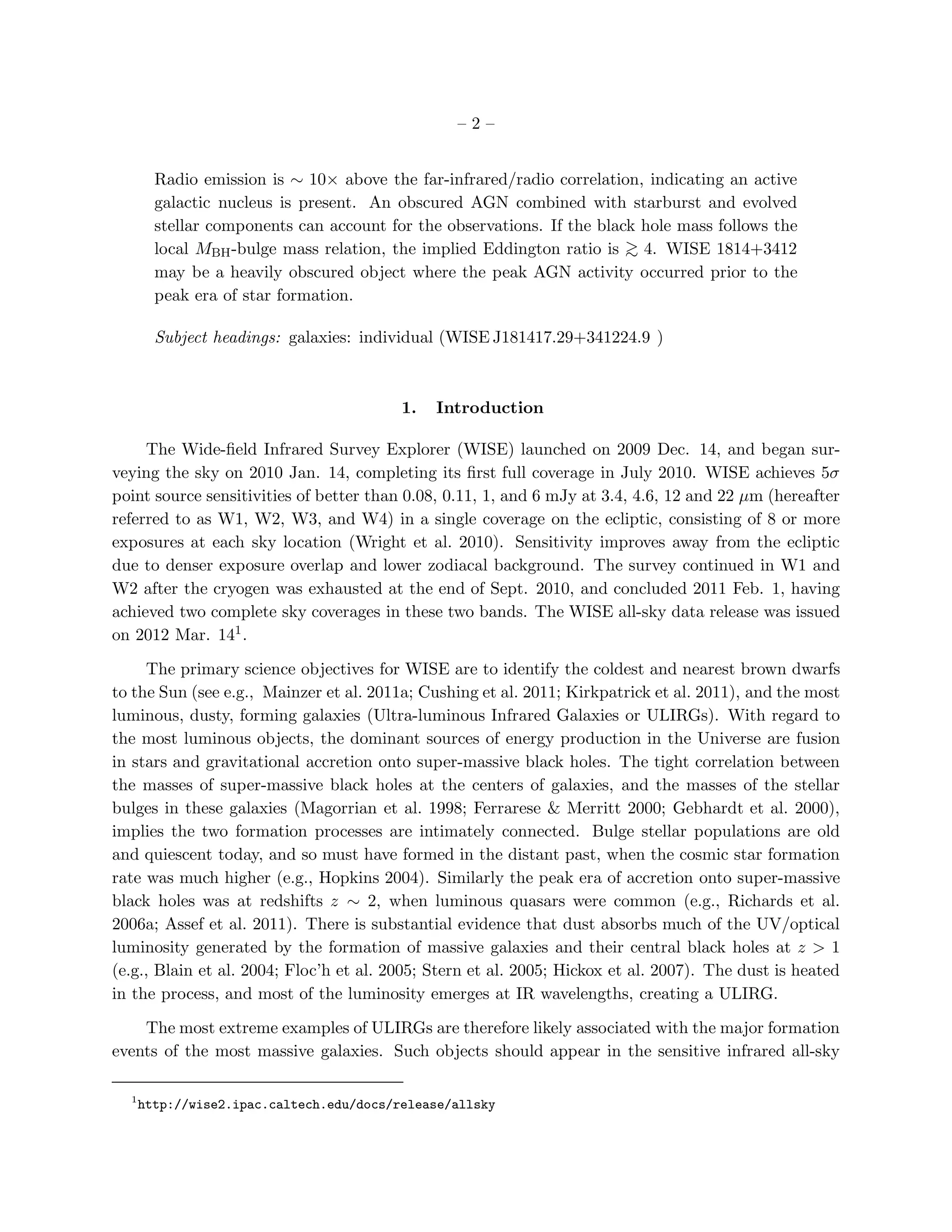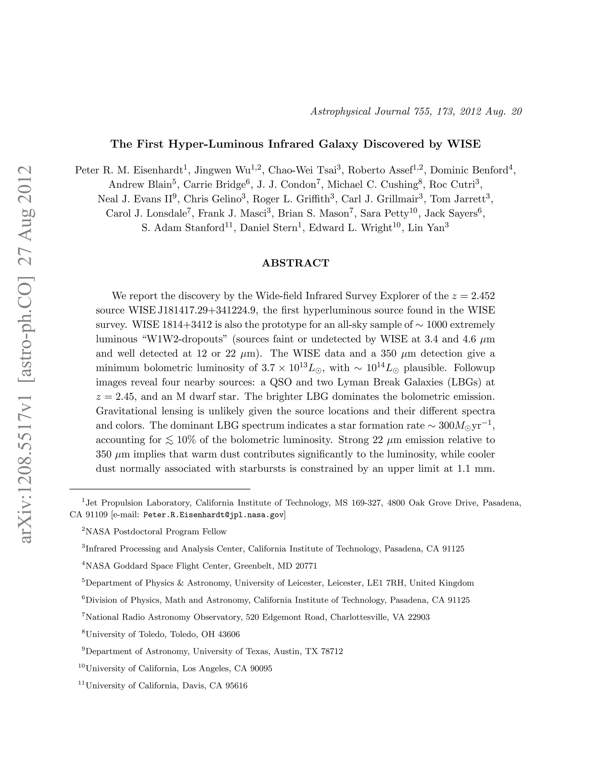 This document summarizes the discovery of WISE J181417.29+341224.9 (WISE 1814+3412), the first hyper-luminous infrared galaxy (LIR > 1013 L⊙) discovered by the Wide-field Infrared Survey Explorer (WISE). Follow-up images of WISE 1814+3412 revealed four nearby sources - a QSO, two Lyman Break Galaxies at z=2.45, and an M dwarf star. The brighter LBG dominates the bolometric emission of WISE 1814+3412 and has a star formation rate of ~300M⊙ yr−1, accounting for <10% of the total luminosity. An obscured