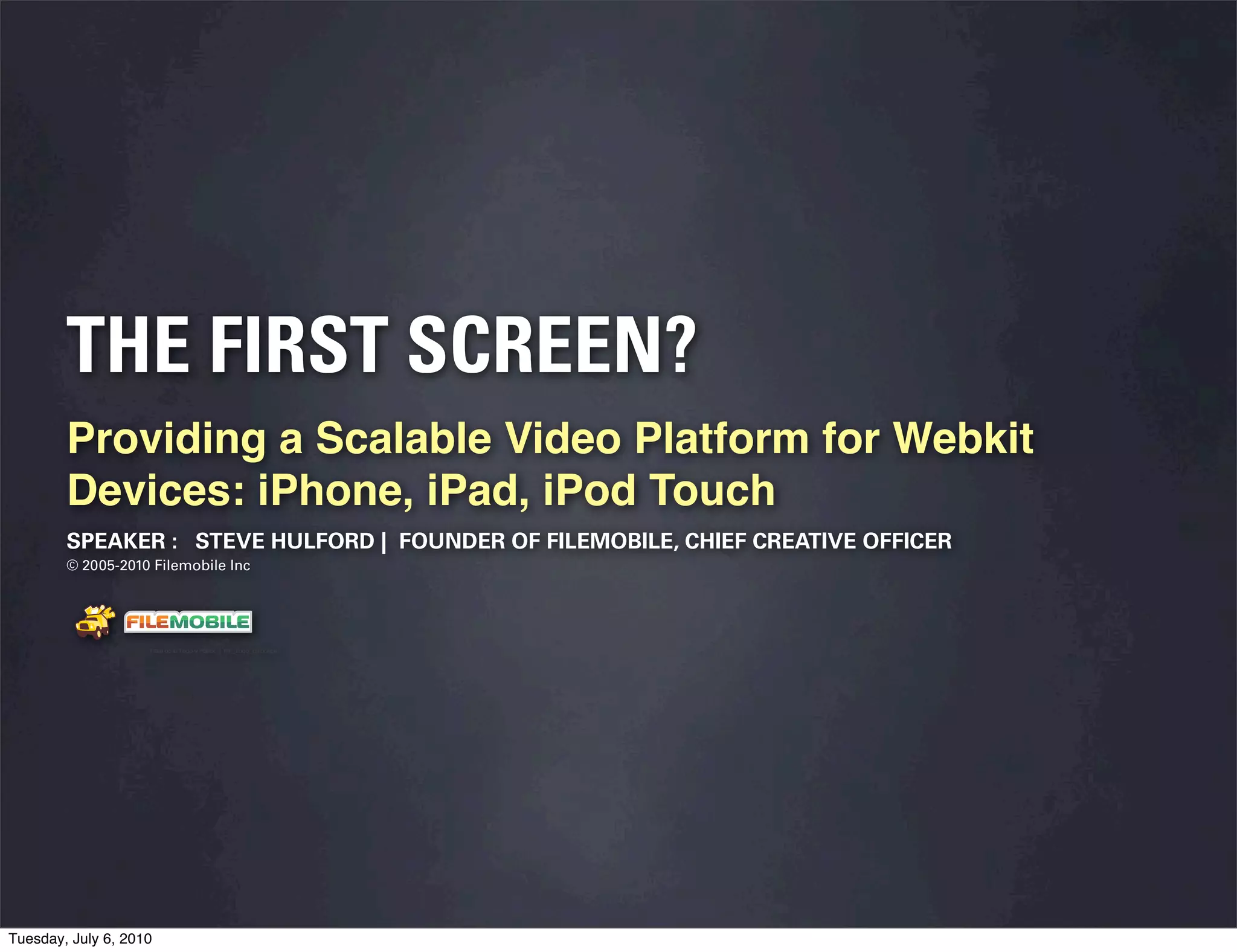 Steve Hulford discusses providing a scalable video platform for mobile devices like the iPhone, iPad, and iPod Touch. He notes that mobile video consumption is growing rapidly, especially among teens, and is driven primarily by smartphones. The presentation covers the increasing popularity of mobile video, projections for further growth, and strategies for platforms and delivery to make mobile video easy.