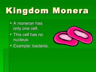 The document describes the five kingdoms of life - Monera, Protista, Fungi, Plantae, and Animalia. It provides key distinguishing characteristics for each kingdom, including whether cells are unicellular or multicellular, whether they contain nuclei, how they obtain nutrients or energy, and examples of organisms from each kingdom.