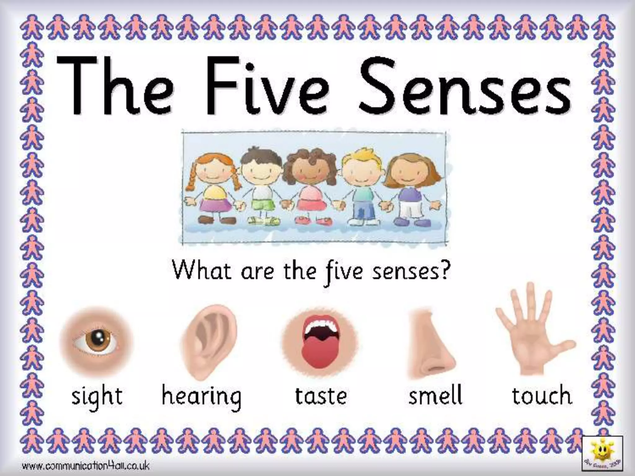 This document provides information about the five senses - taste, touch, smell, hearing, and sight. It discusses the organs and body parts involved in each sense. For taste, it describes how the tongue contains taste buds that identify flavors. For touch, it notes that the skin and nerves receive sensory information. For smell, it explains how the nose and olfactory nerve detect scents. For hearing, it mentions the ear and how sound vibrations are perceived. And for sight, it outlines how light enters the eye and the retina forms images that the optic nerve relays to the brain. The document includes questions and activities to help teach about each of the five senses.