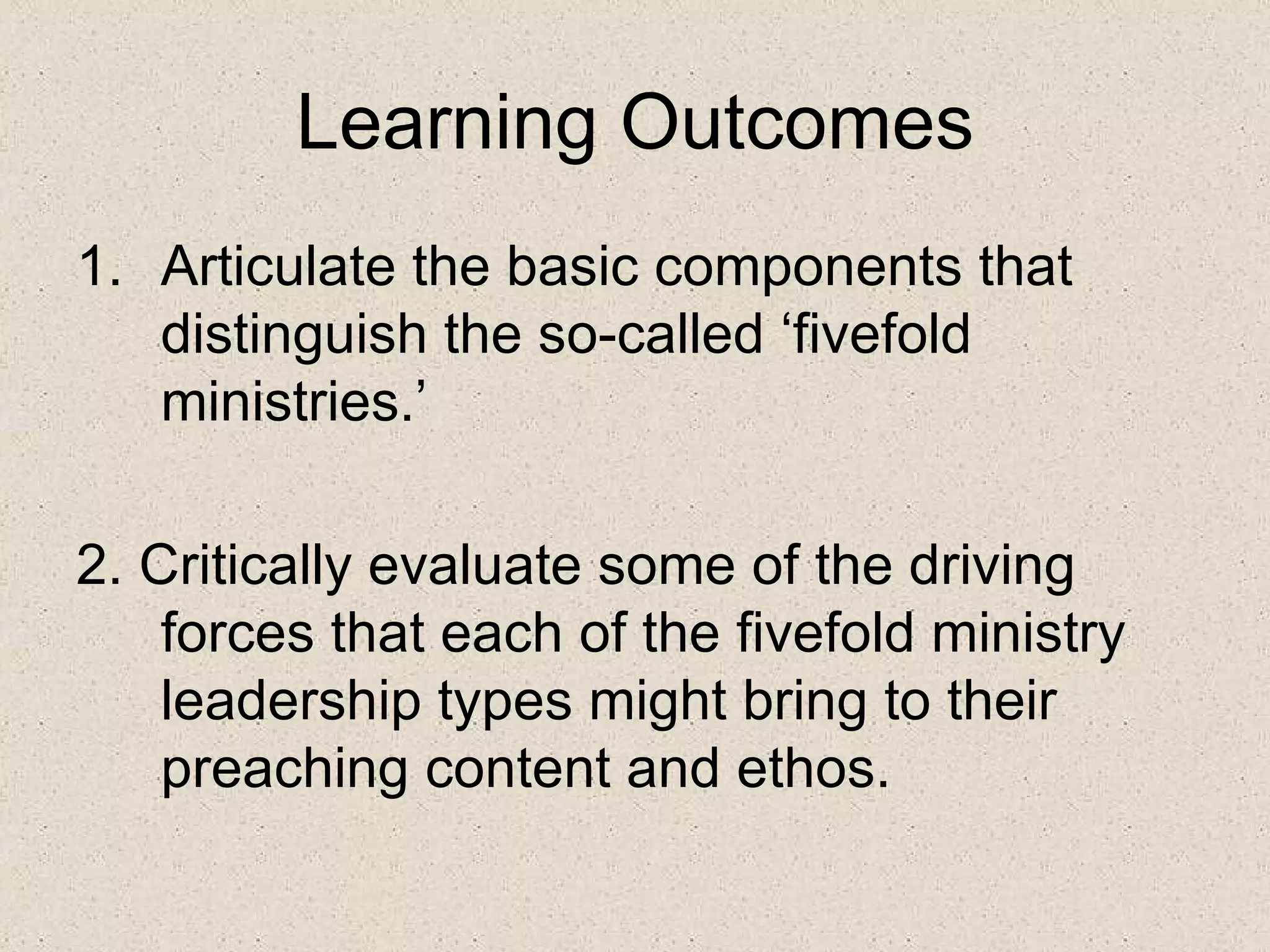 The document explores the 'five-fold ministries' outlined in Ephesians 4:11-12, detailing how each type—apostles, prophets, evangelists, pastors, and teachers—can influence preaching styles and content. It discusses the unique attributes and challenges of each ministry, emphasizing the need for churches to recognize and utilize these diverse gifts in order to enhance preaching effectiveness. Additionally, it encourages self-reflection on personal leadership gifts and their ability to shape one's preaching approach.