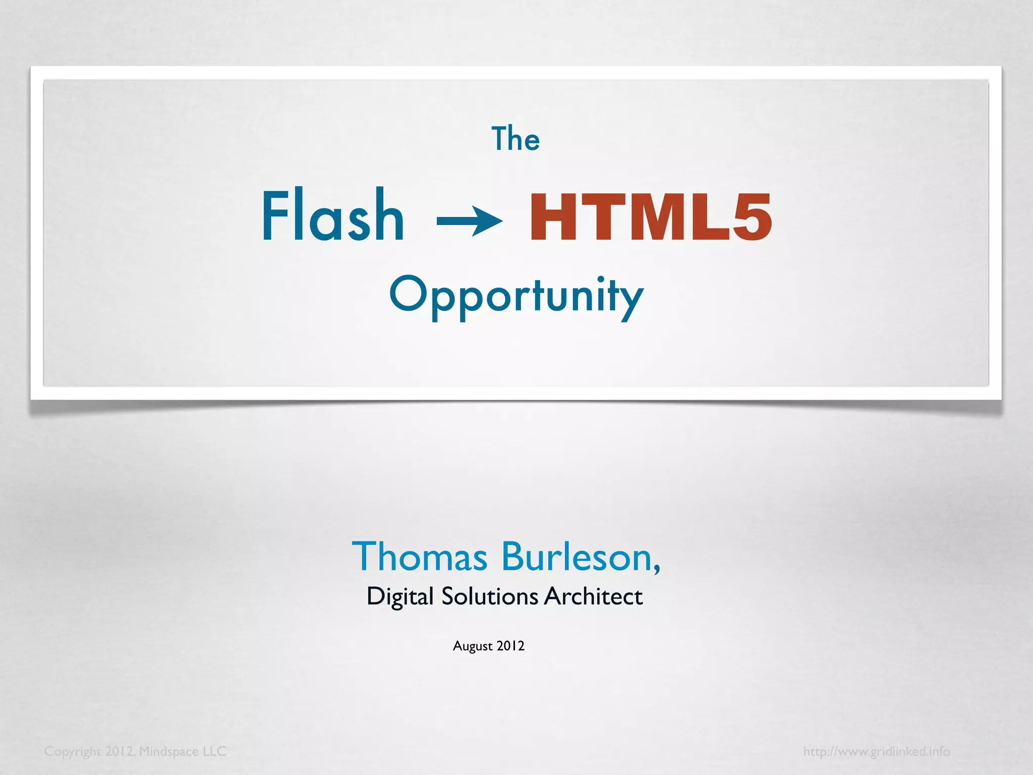 The document discusses the transition from Flash to HTML5 and the opportunities it presents for cross-browser, cross-device compatibility, and enhanced user experiences. It highlights the features of HTML5, such as offline capabilities, semantic tags, and responsive design, while outlining a migration strategy for existing Flash applications. Additionally, it emphasizes the importance of targeted product design and cloud-based services to effectively implement these changes.