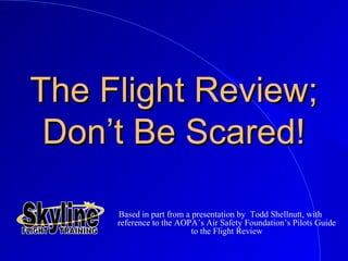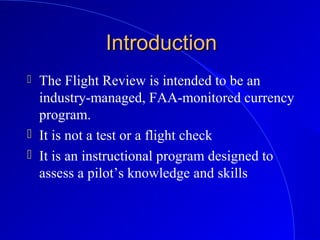 The document provides guidelines for conducting flight reviews, which are mandatory for pilots to maintain their currency and proficiency in flying. It outlines the regulatory requirements, structure of the review including both ground and flight instruction, as well as the responsibilities of both instructors and pilots during the review process. Additionally, it addresses various questions from pilots and instructors related to the procedures, requirements, and implications of flight reviews.